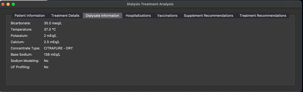 - Comprehensive Dialysate Information: Get a clear and concise view of key dialysate parameters, including Bicarbonate, Temperature, Potassium, Calcium, Concentrate Type (e.g., CITRAPURE – DRY), and Base Sodium.
